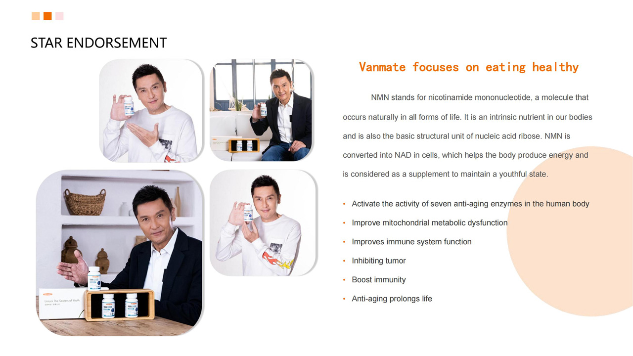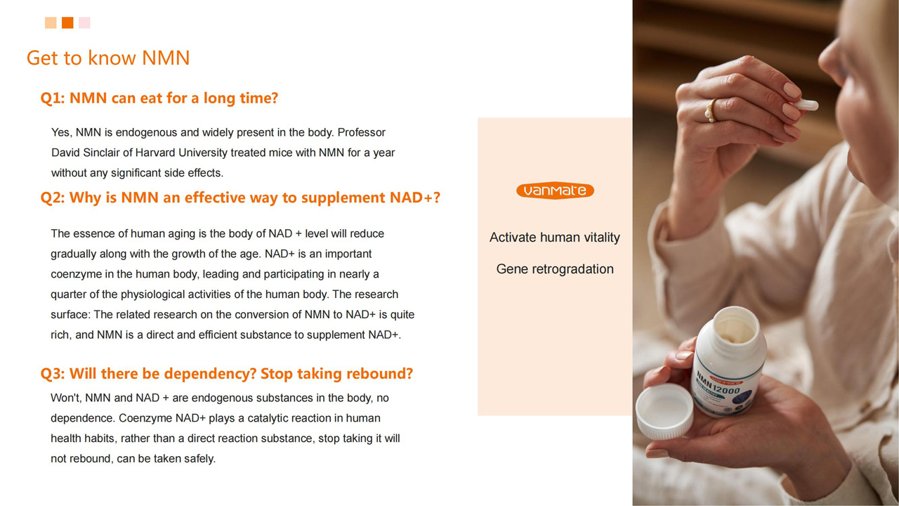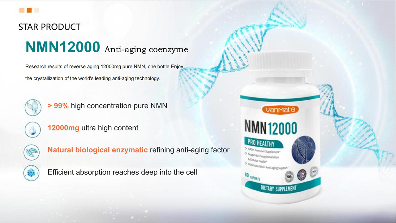 NMN is a nicotinamide mononucleotide that is found naturally in the human body and is also found in some fruits and vegetables. NMN is the precursor of NAD+ in human body. NAD+ is the key to maintain the young state, and NMN is the most effective way to supplement NAD+